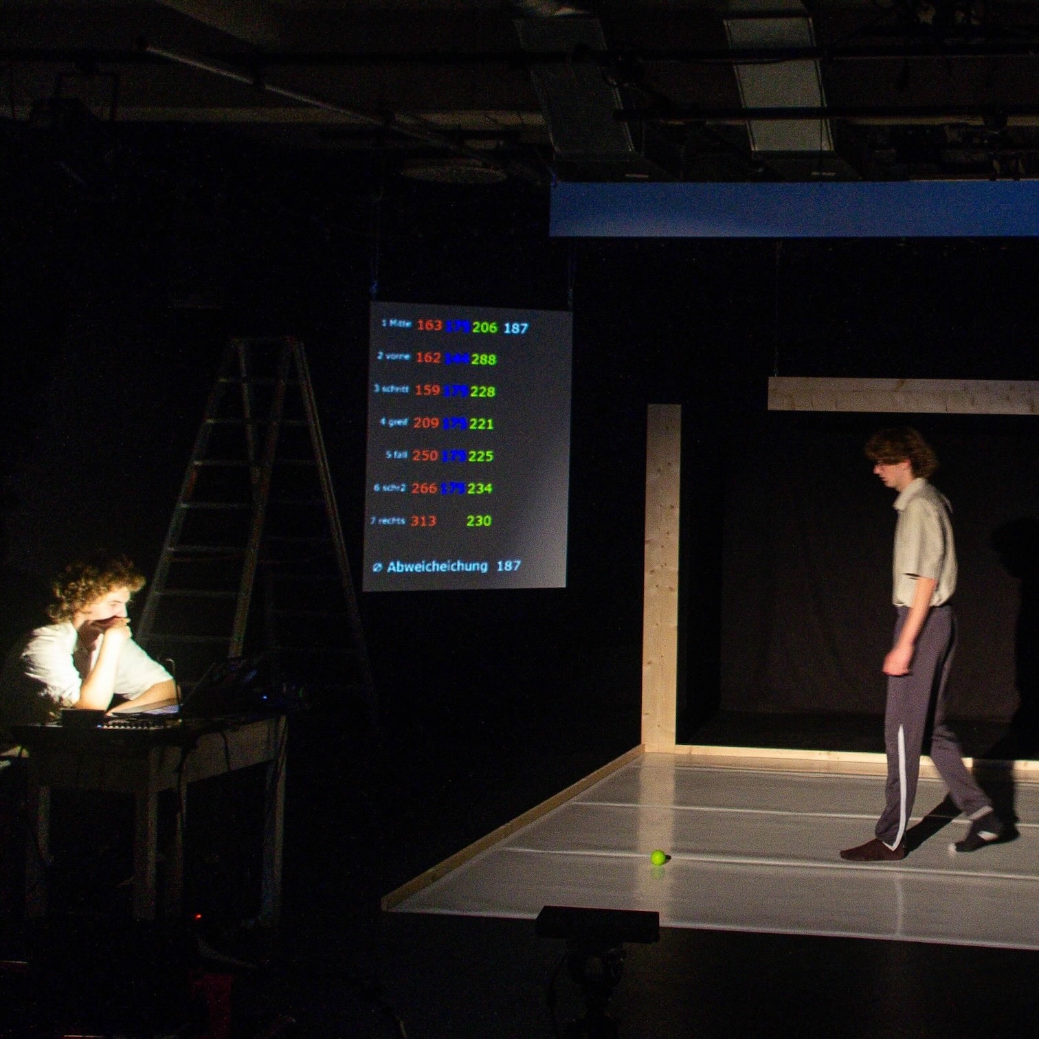 Im Mittelpunkt der Aufführung stand das intensive Spiel mit Rekonstruktion und Wiederholung. In einem durch Koordinatenachsen definierten, dreidimensionalen Versuchsraum wurde eine einfache Handlung festgehalten: Der Akteur Til Linder hebt den Ball auf und lässt ihn erneut aufspringen. Doch damit begann das eigentliche Experiment erst. Immer wieder wurde die Szene nachgestellt, akribisch von Flynn Moers aufgezeichnet und analysiert – erst rein räumlich, später auch auf der zeitlichen Ebene. Wie exakt lässt sich eine Bewegung wiederholen? Wie groß ist die Abweichung?